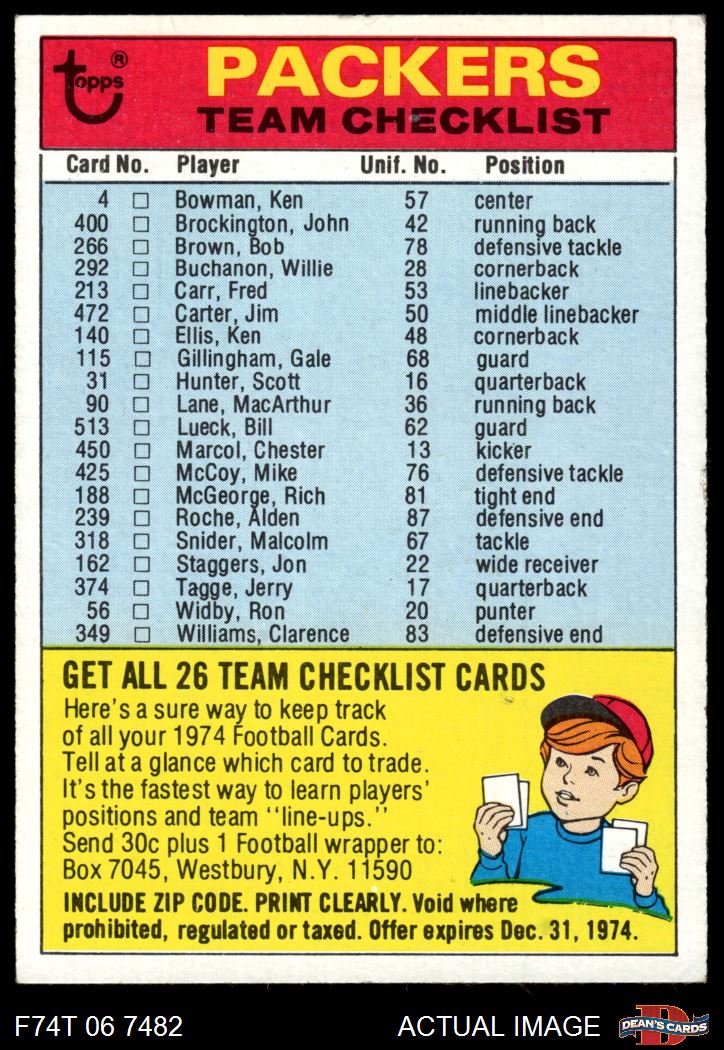 1974 Topps Checklist Green Bay Packers Team 6.5 - EX/MT+