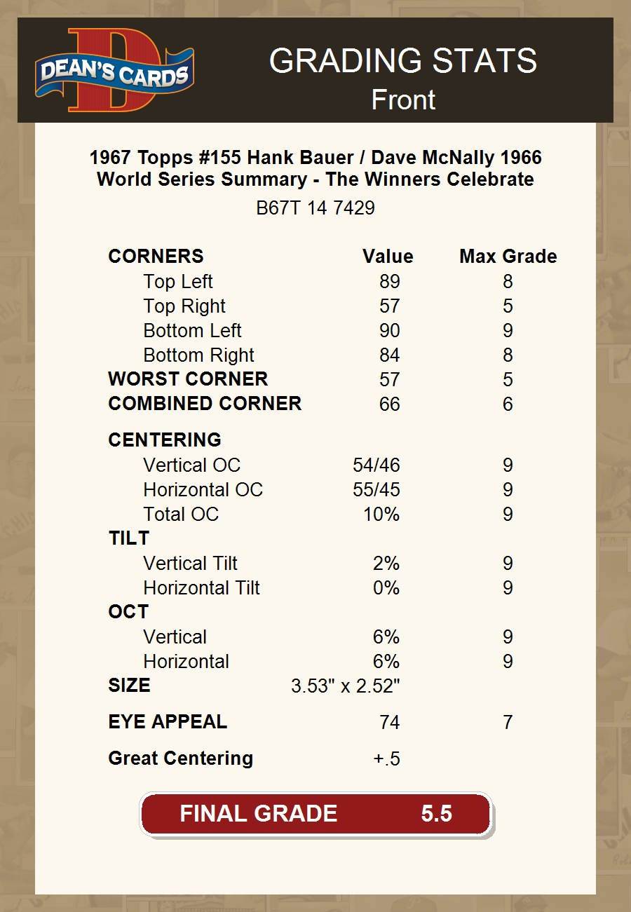 1967 Topps #155 Hank Bauer / Dave McNally 1966 World Series Summary - The Winners Celebrate 5.5 - EX+