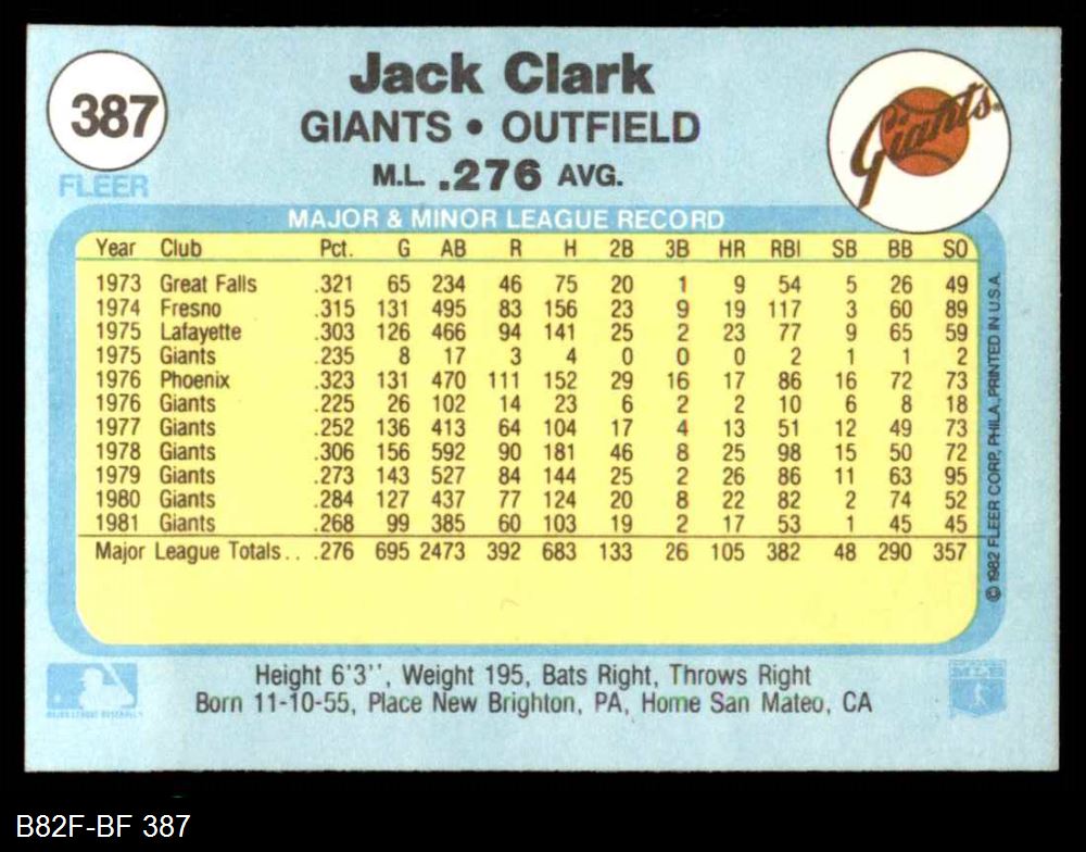 1982 Fleer #387 Jack Clark