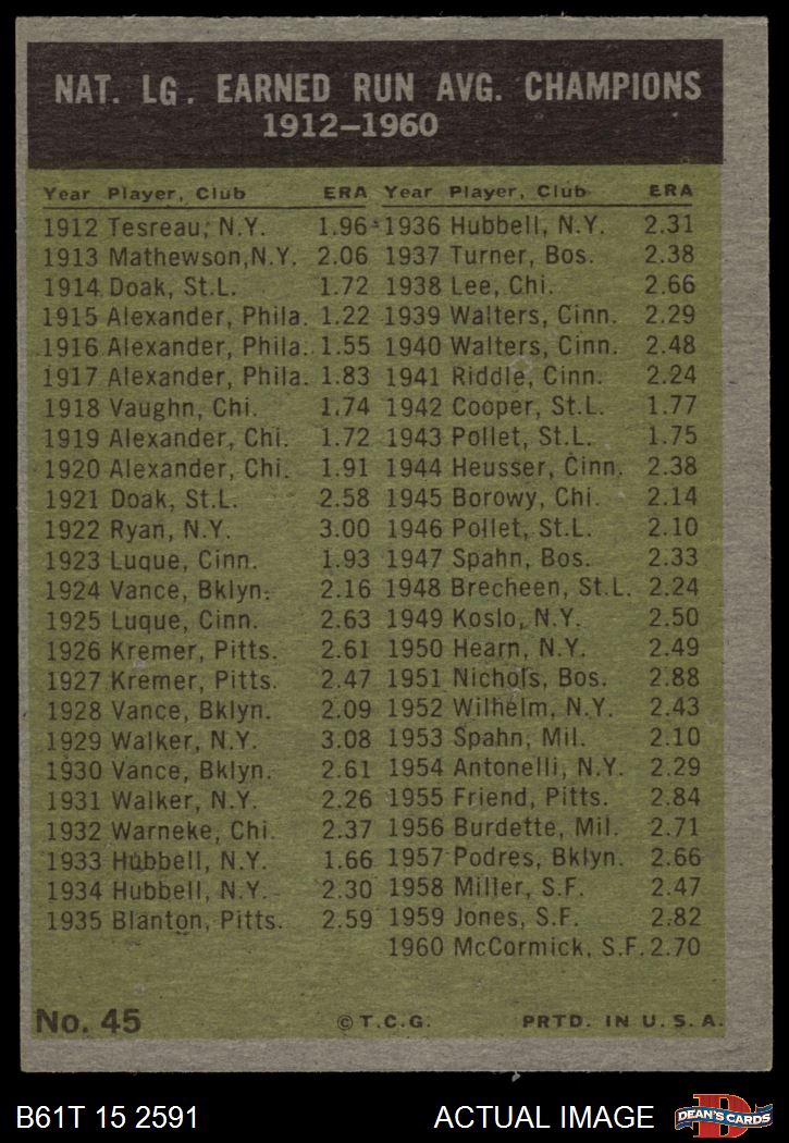 1961 Topps #45 NL ERA Leaders