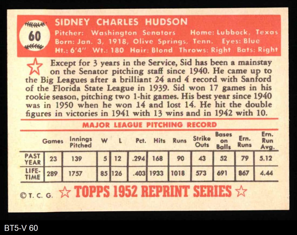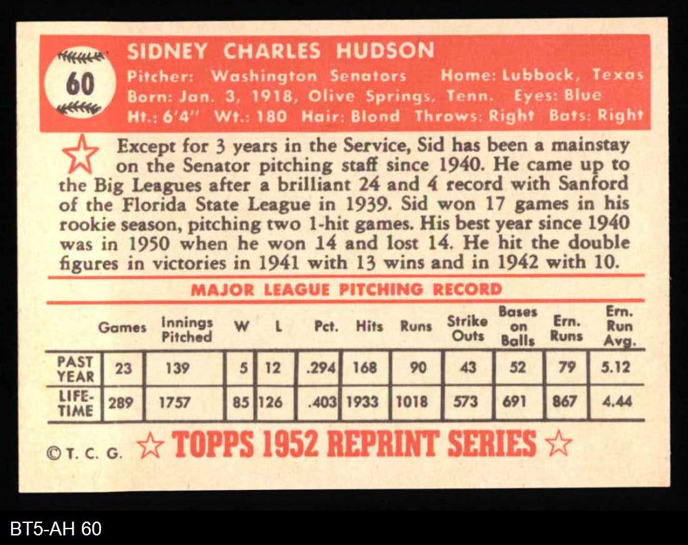 1952 Topps REPRINT #60 Sid Hudson 8 - NM/MT