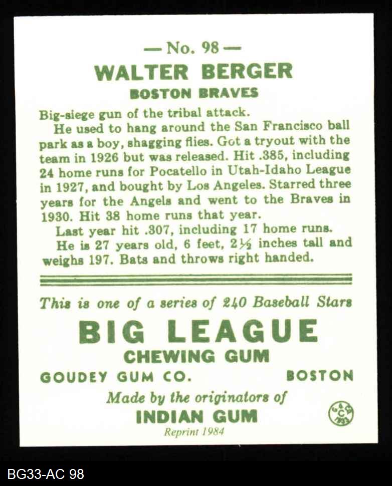 1933 Goudey Reprint #98 Wally Berger 8 - NM/MT