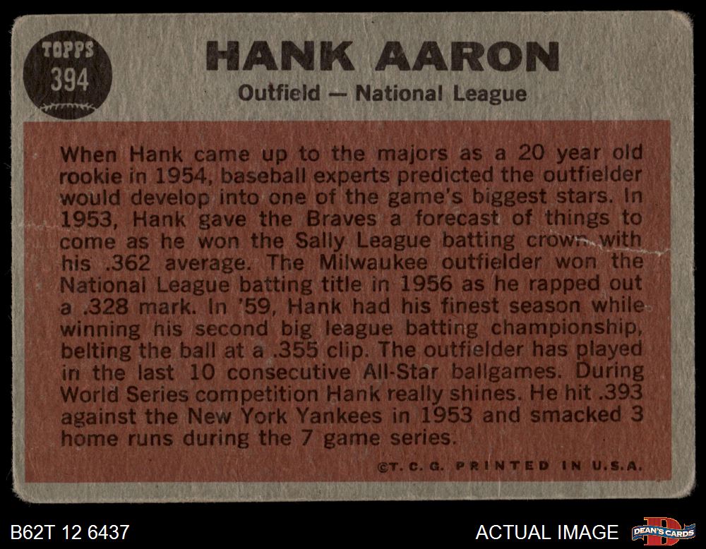 1962 Topps #394 - Hank Aaron All-Star 1 - POOR
