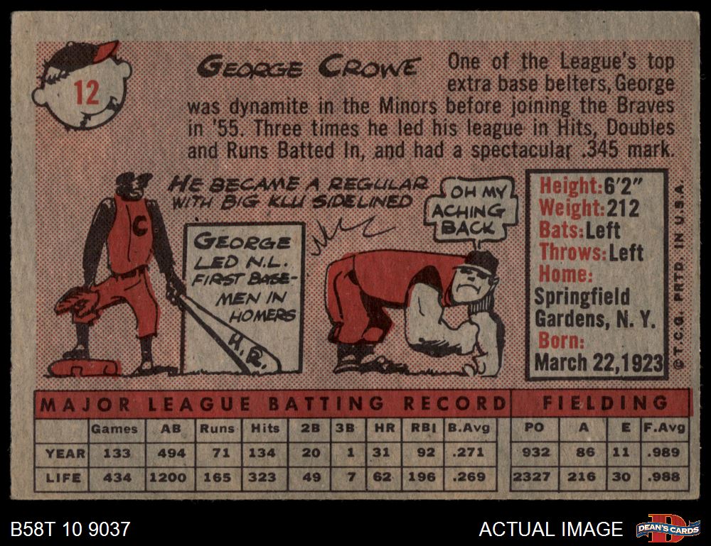 1958 Topps #12 Birth Date should be 1921 George Crowe 4 - VG/EX