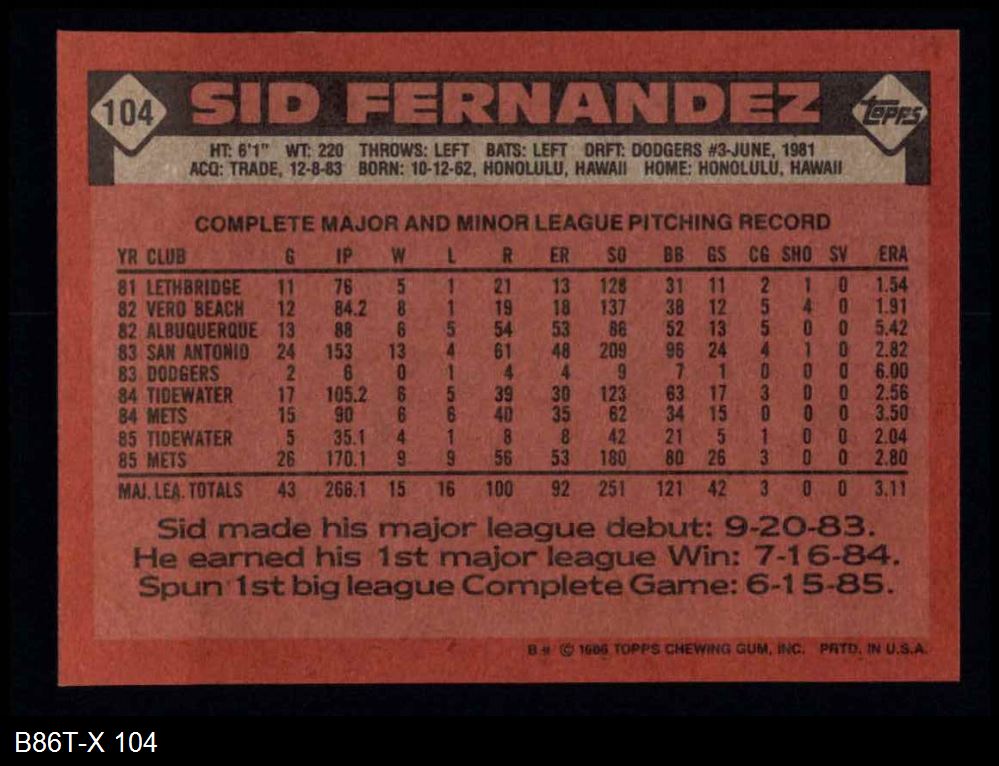 1986 Topps #104 Sid Fernandez 8 - NM/MT
