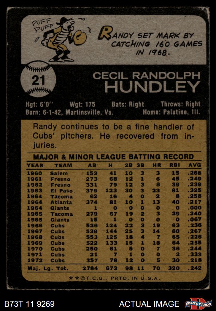 1973 Topps #21 Randy Hundley 2 - GOOD