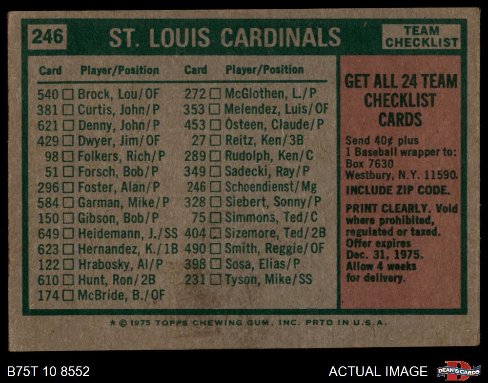1975 Topps #246 - Red Schoendienst Cardinals Team Checklist 2 - GOOD