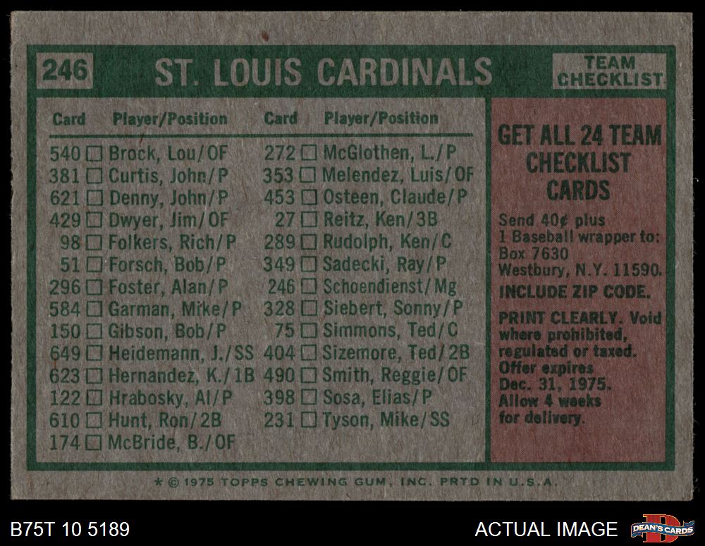 1975 Topps #246 - Red Schoendienst Cardinals Team Checklist 3 - VG