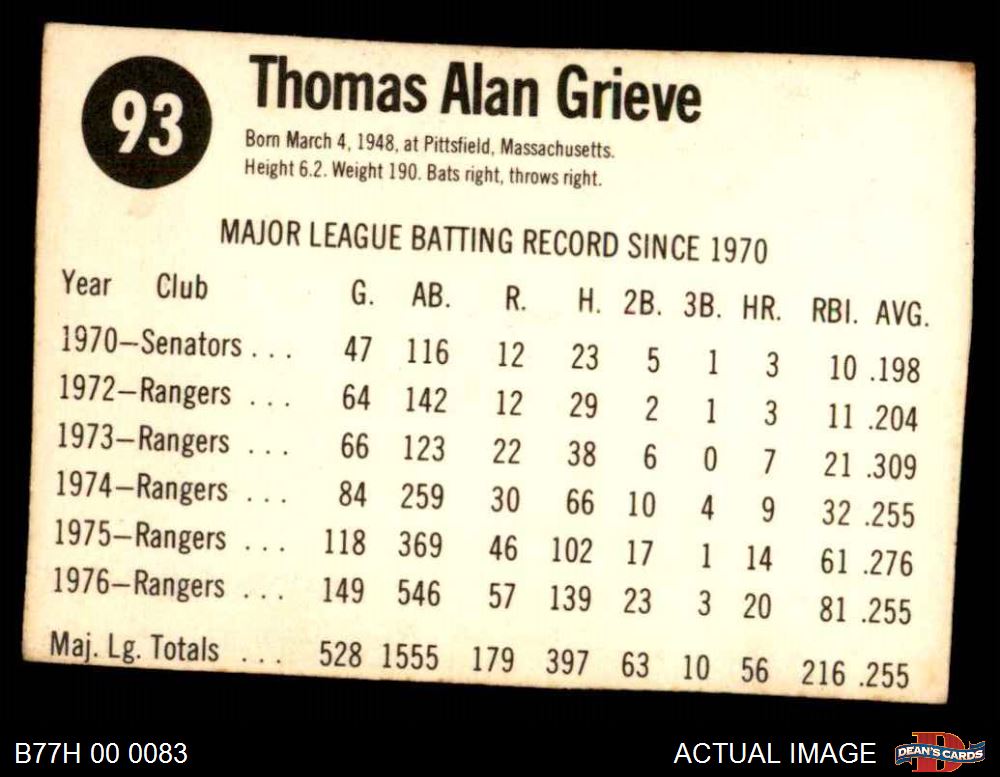 1977 Hostess #93 Tom Grieve 2 - GOOD