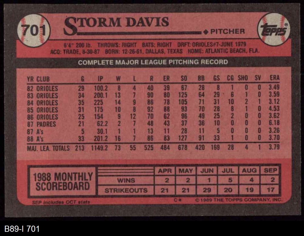 1989 Topps #701 Storm Davis 8 - NM/MT