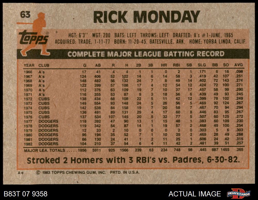 1983 Topps #63 Rick Monday 8 - NM/MT
