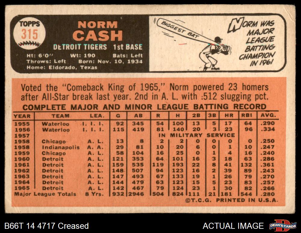 1966 Topps #315 Norm Cash Front Thumbnail