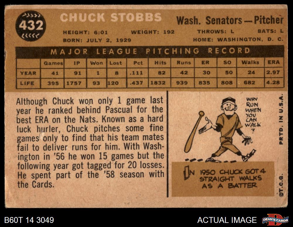 1960 Topps #432 Chuck Stobbs 3 - VG