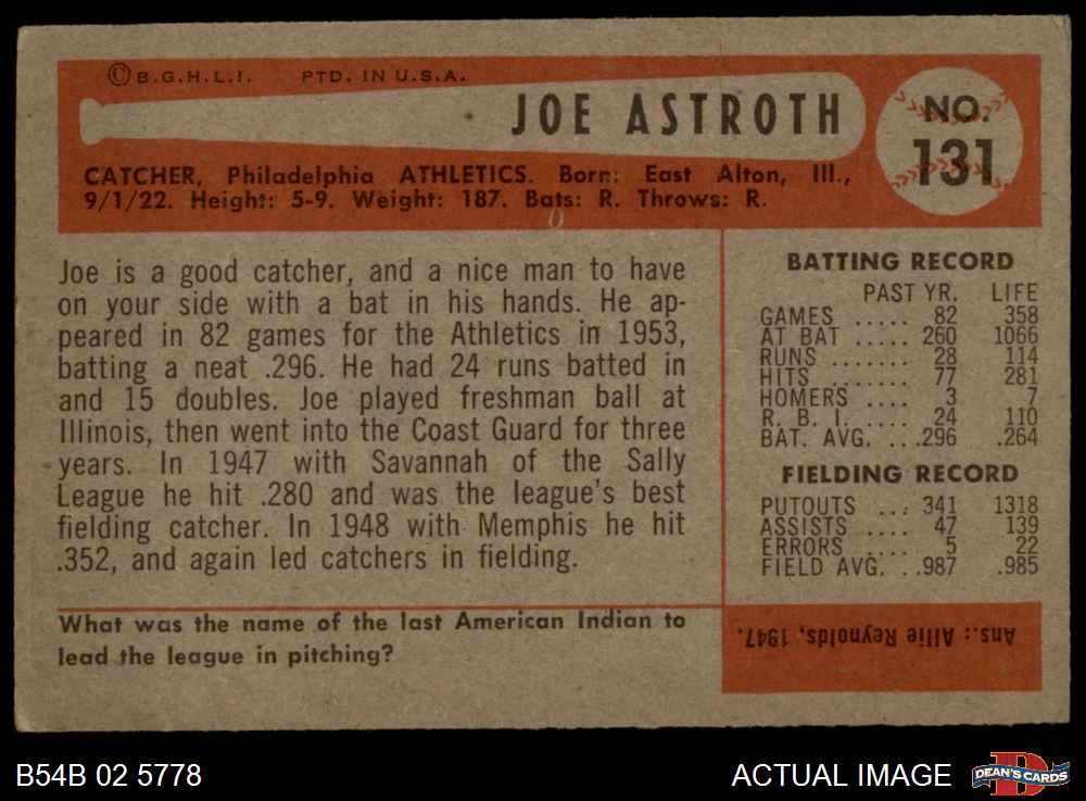 1954 Bowman #131 Joe Astroth 4.5 - VG/EX+