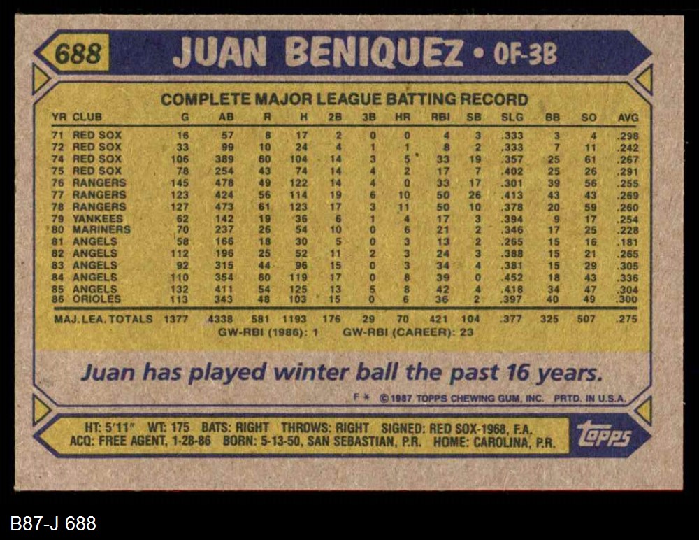 1987 Topps #688 Juan Beniquez