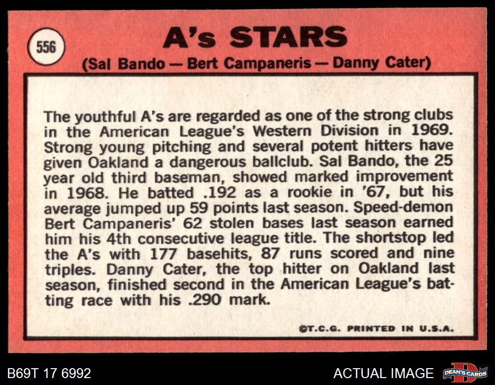 1969 Topps #556 - Sal Bando / Bert Campaneris / Danny Cater A's Stars 5 - EX
