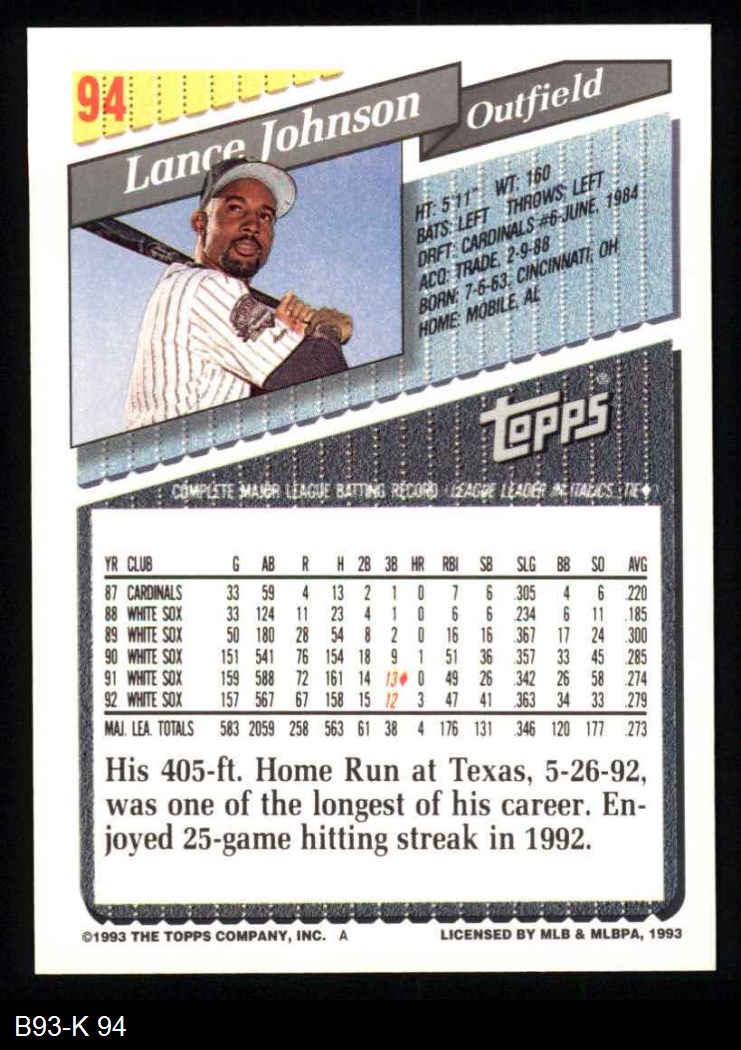 1993 Topps #94 Lance Johnson 8 - NM/MT