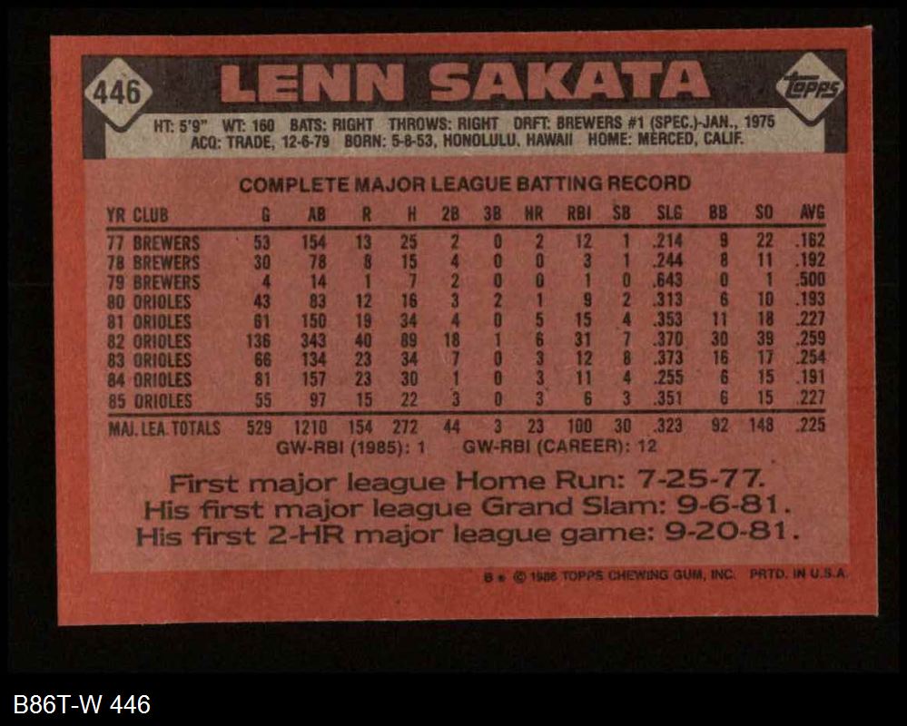 1986 Topps #446 Lenn Sakata 8 - NM/MT