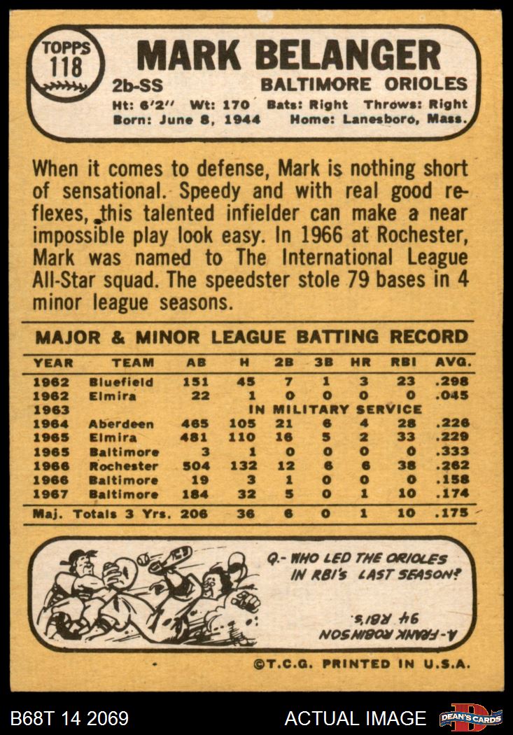 1968 Topps #118 A Mark Belanger 7 - NM