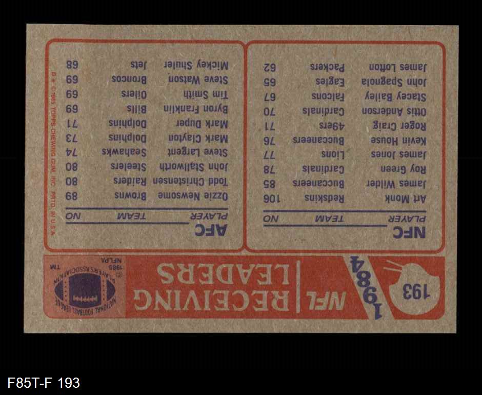 1985 Topps #193 - Ozzie Newsome / Art Monk Receiving Leaders 8 - NM/MT