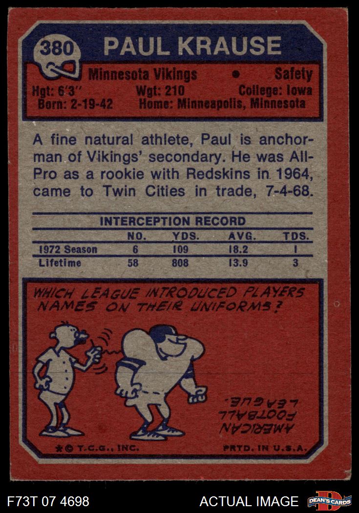1973 Topps #380 Paul Krause 3 - VG