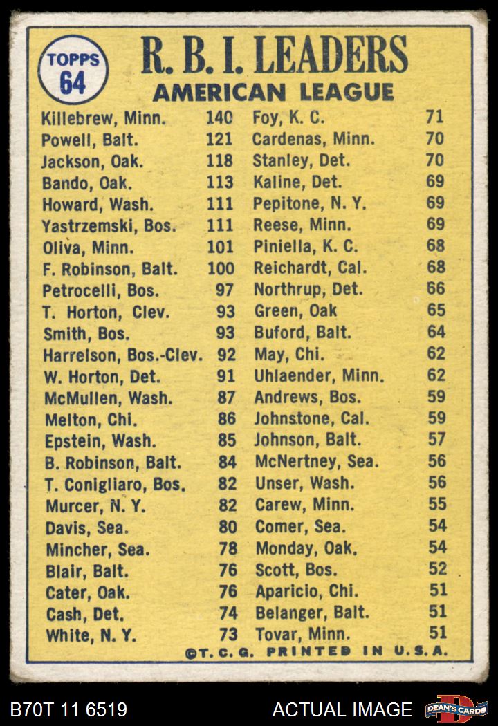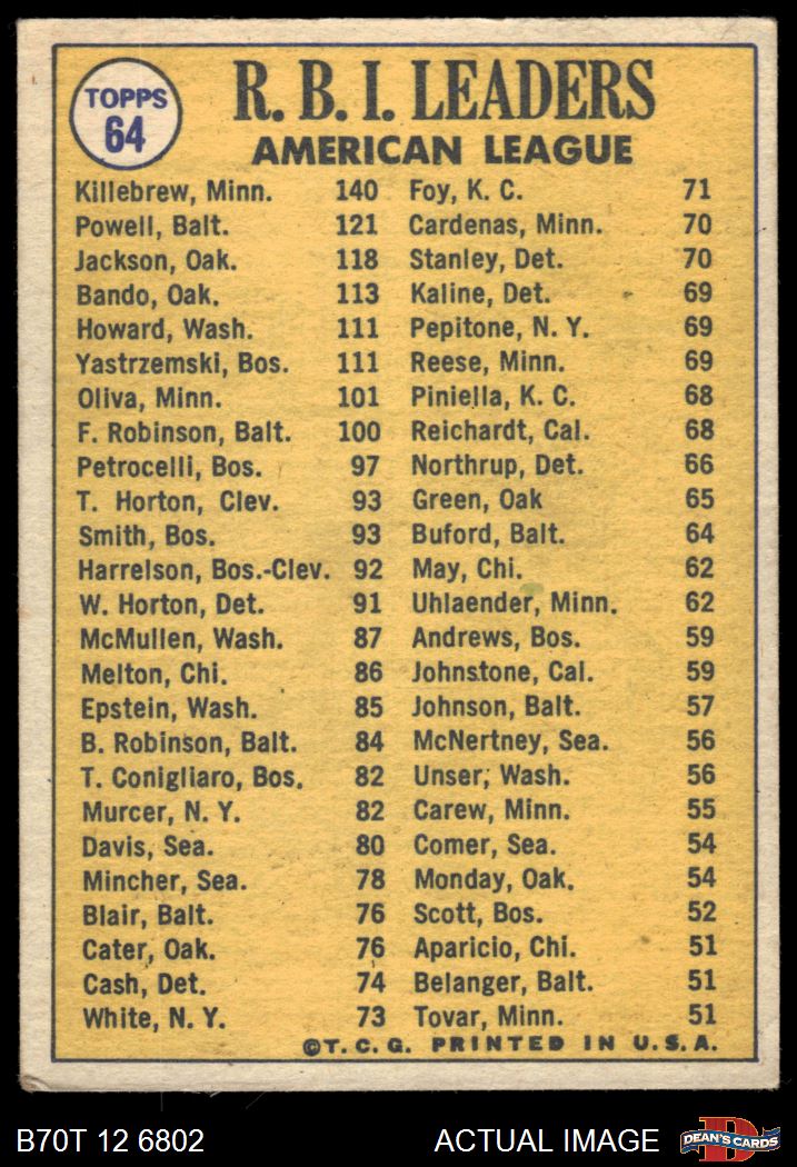 1970 Topps #64 - Reggie Jackson / Harmon Killebrew / Boog Powell AL RBI Leaders 3 - VG