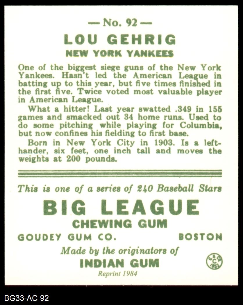 1933 Goudey Reprint #92 Lou Gehrig 8 - NM/MT