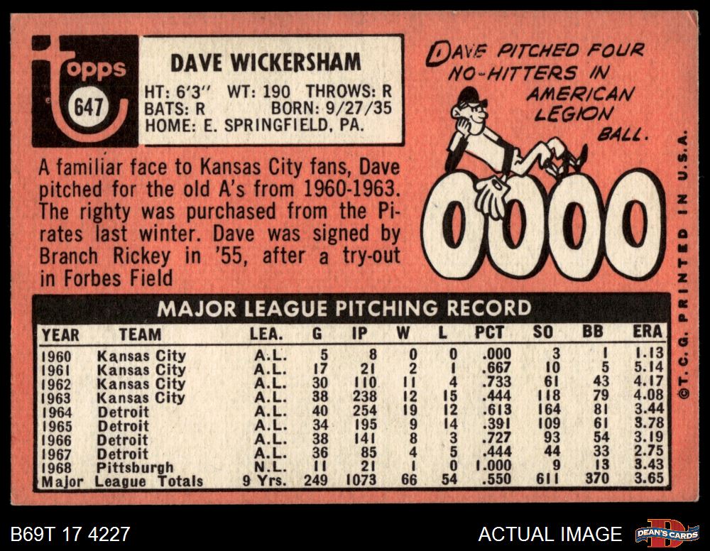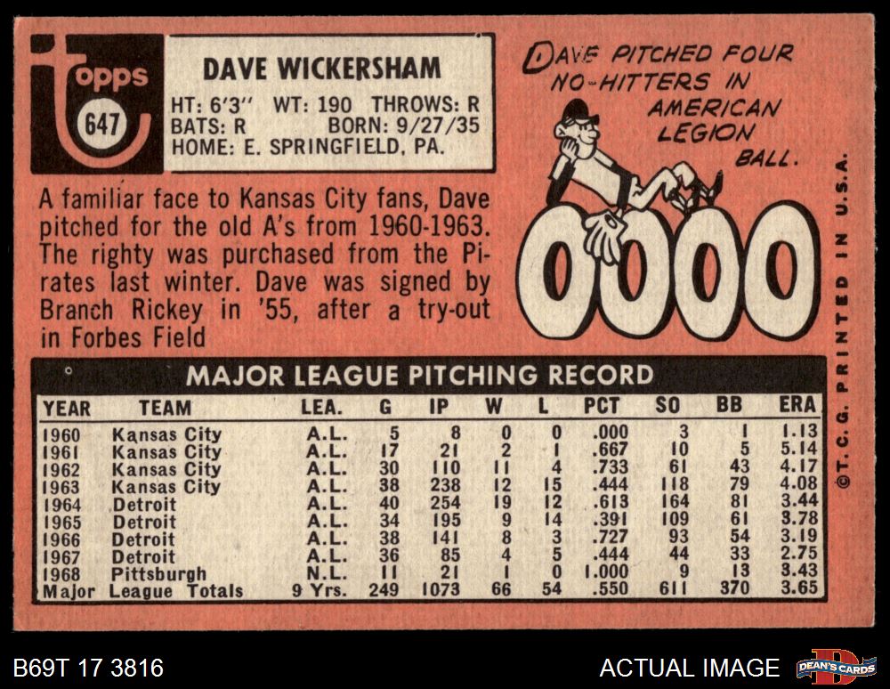 1969 Topps #647 Dave Wickersham 4 - VG/EX