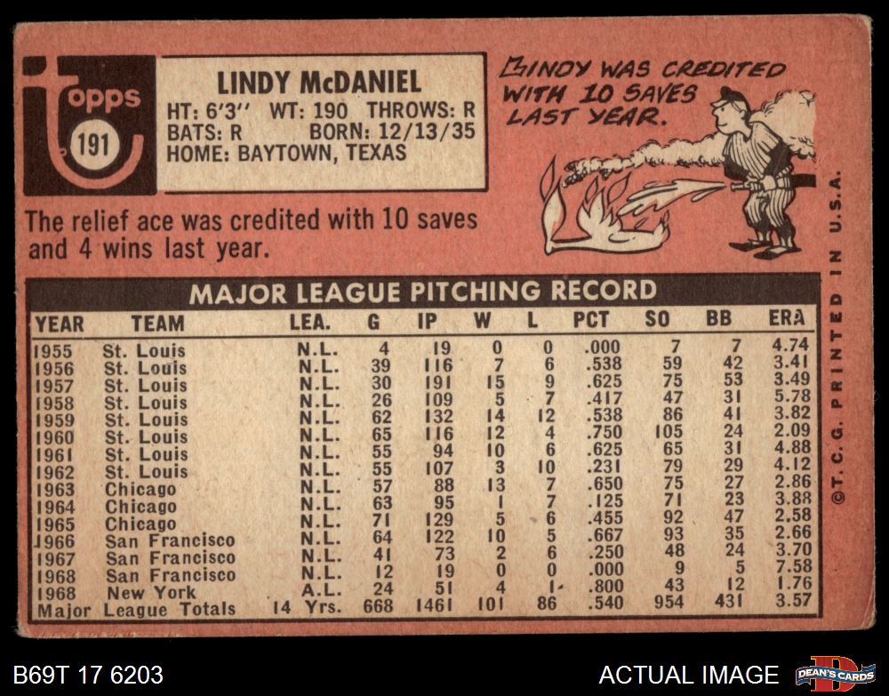 1969 Topps #191 Lindy McDaniel 1.5 - FAIR
