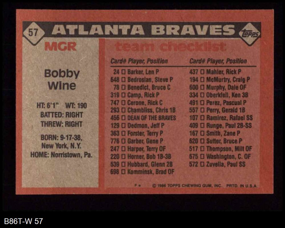 1986 Topps #57 Should have been card #51 - Bobby Wine Braves Team Checklist 8 - NM/MT
