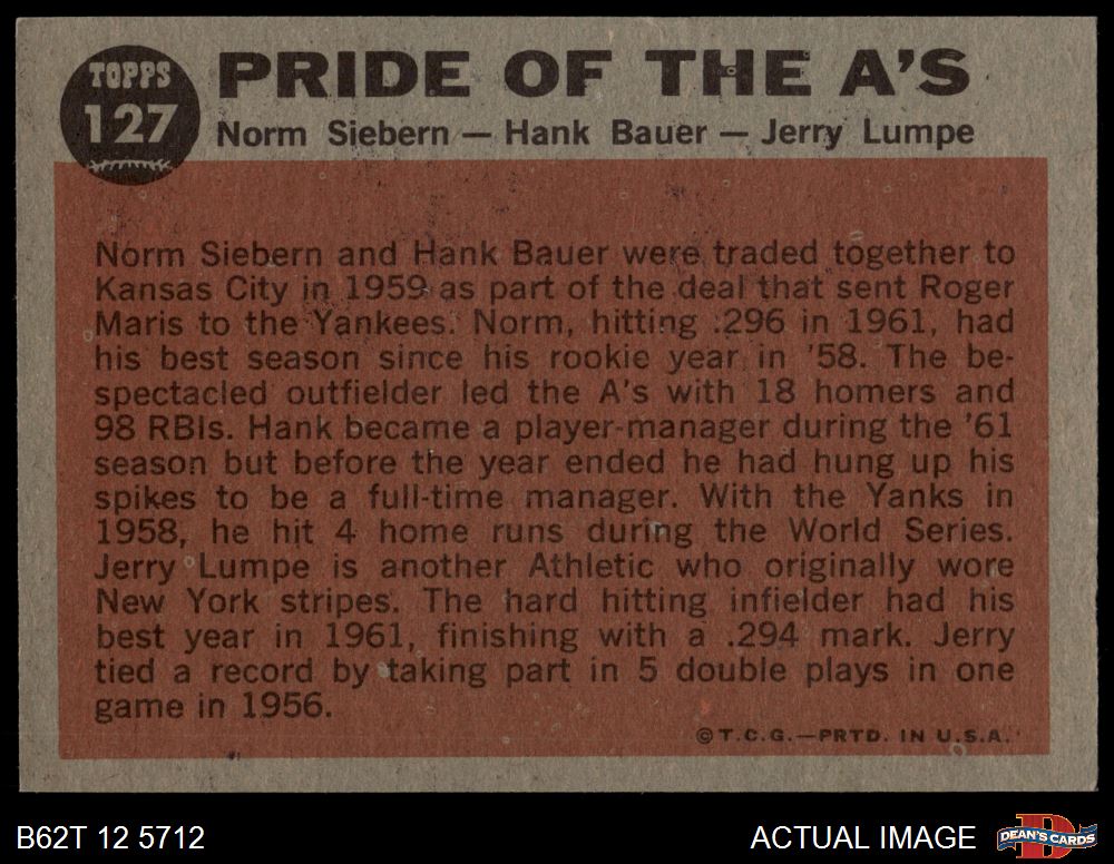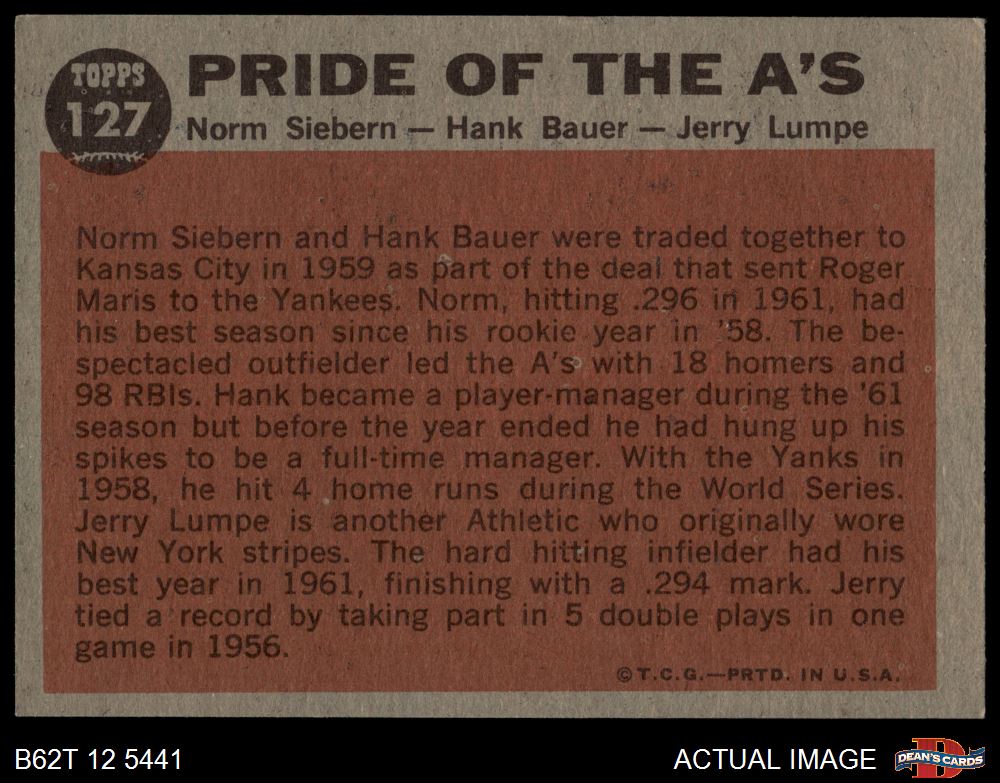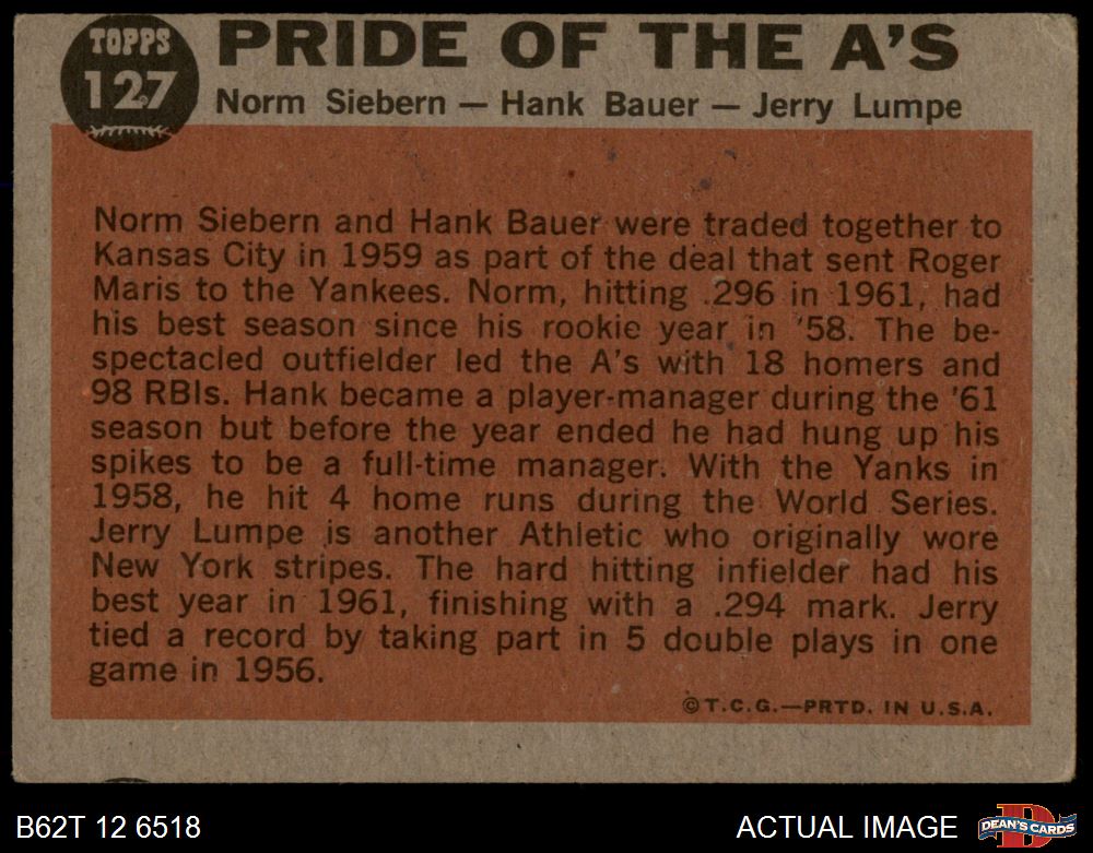 1962 Topps #127 NRM - Norm Siebern / Hank Bauer / Jerry Lumpe Pride of the A's 1.5 - FAIR