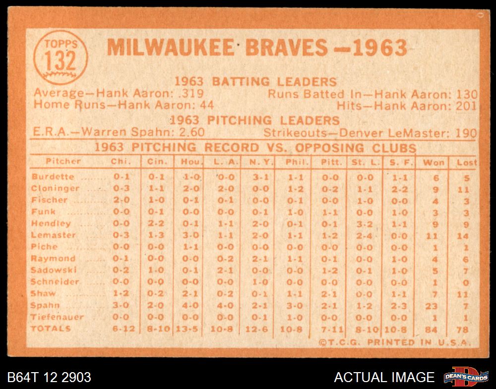 1964 Topps #132 Braves Team 5.5 - EX+