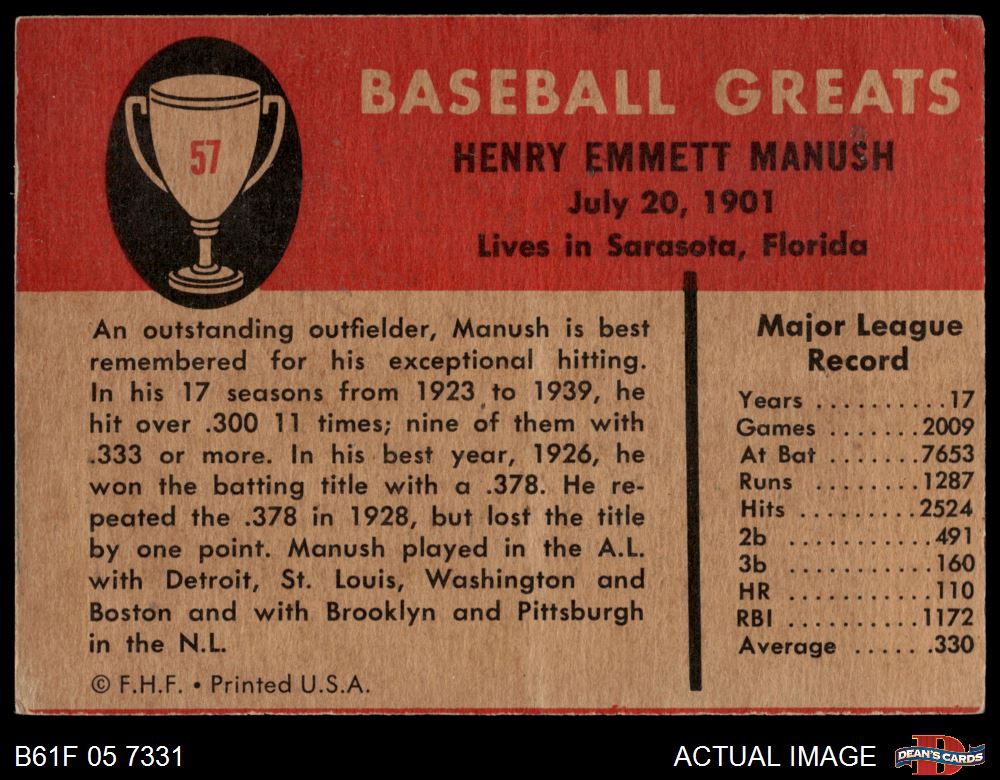 1961 Fleer #57 Heinie Manush 3 - VG