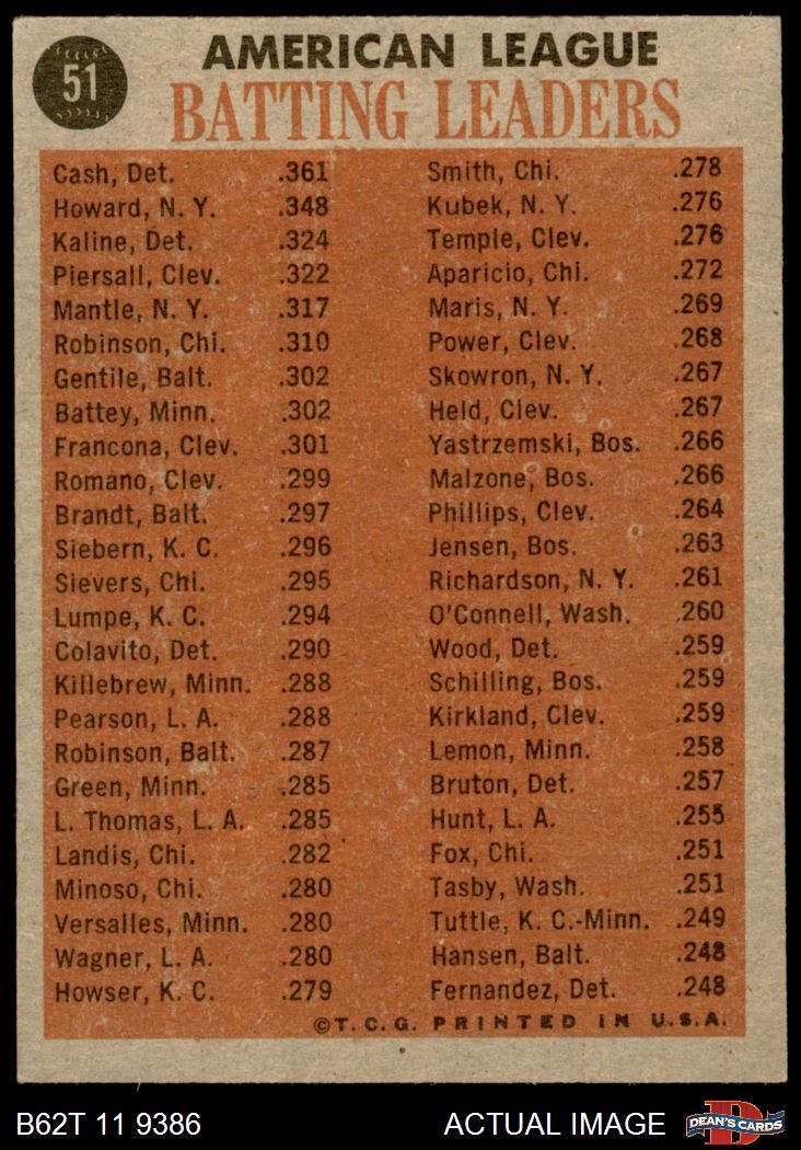1962 Topps #51 AL Batting Leaders