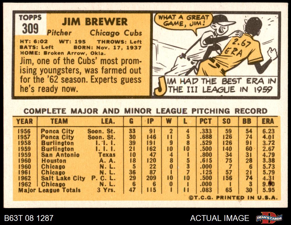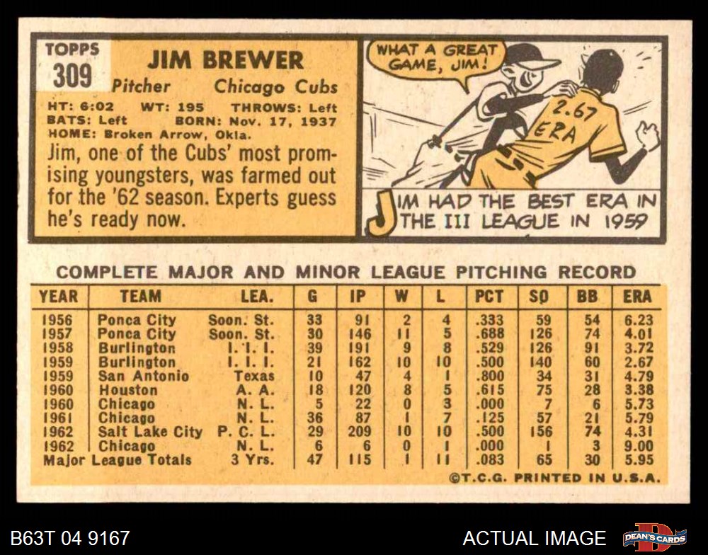 1963 Topps #309 Jim Brewer 8 - NM/MT