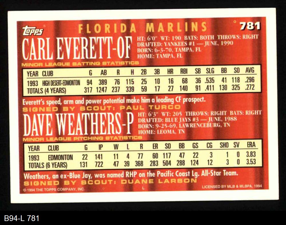 1994 Topps #781 - Carl Everett / Dave Weathers Coming Attractions 8 - NM/MT