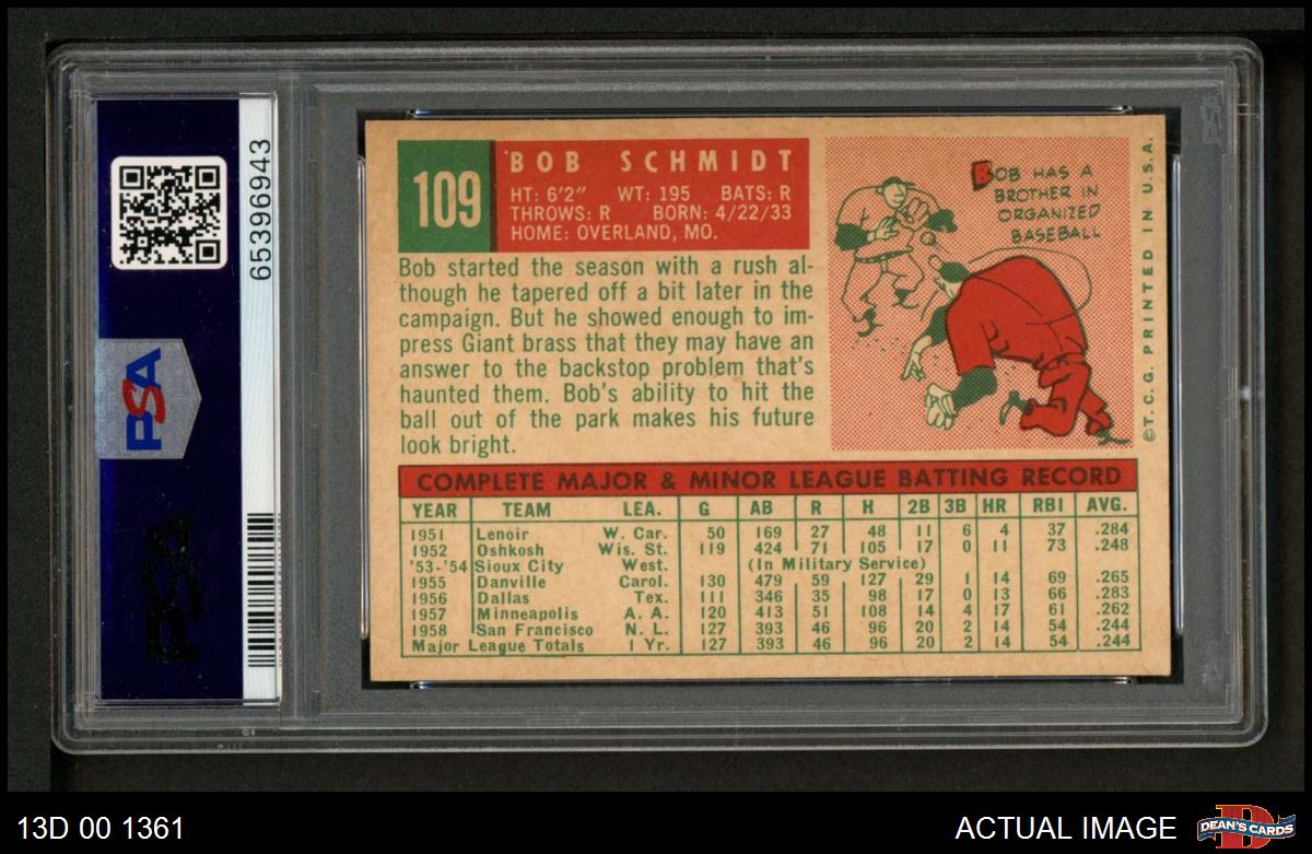 1959 Topps #109 Bob Schmidt PSA 7 - NM