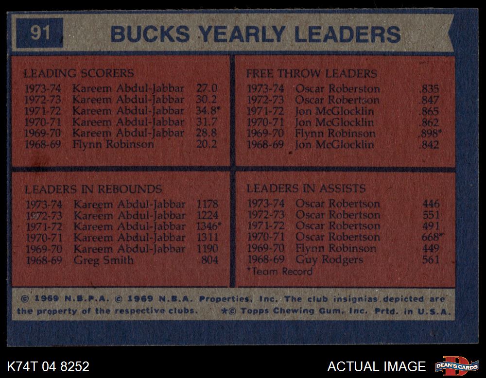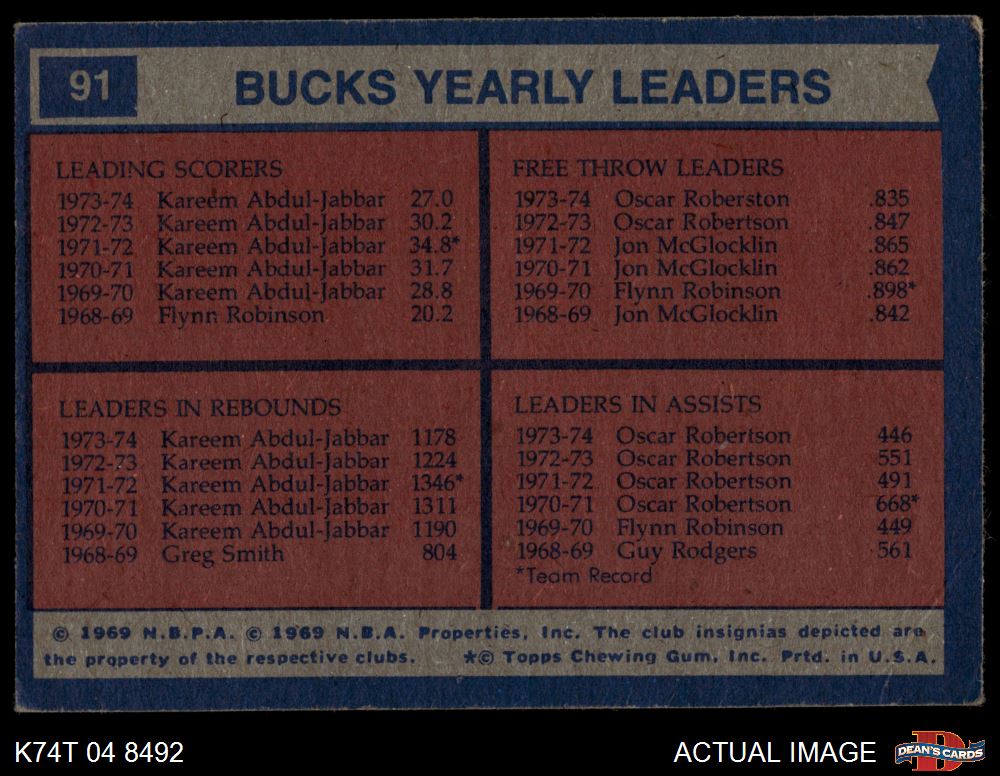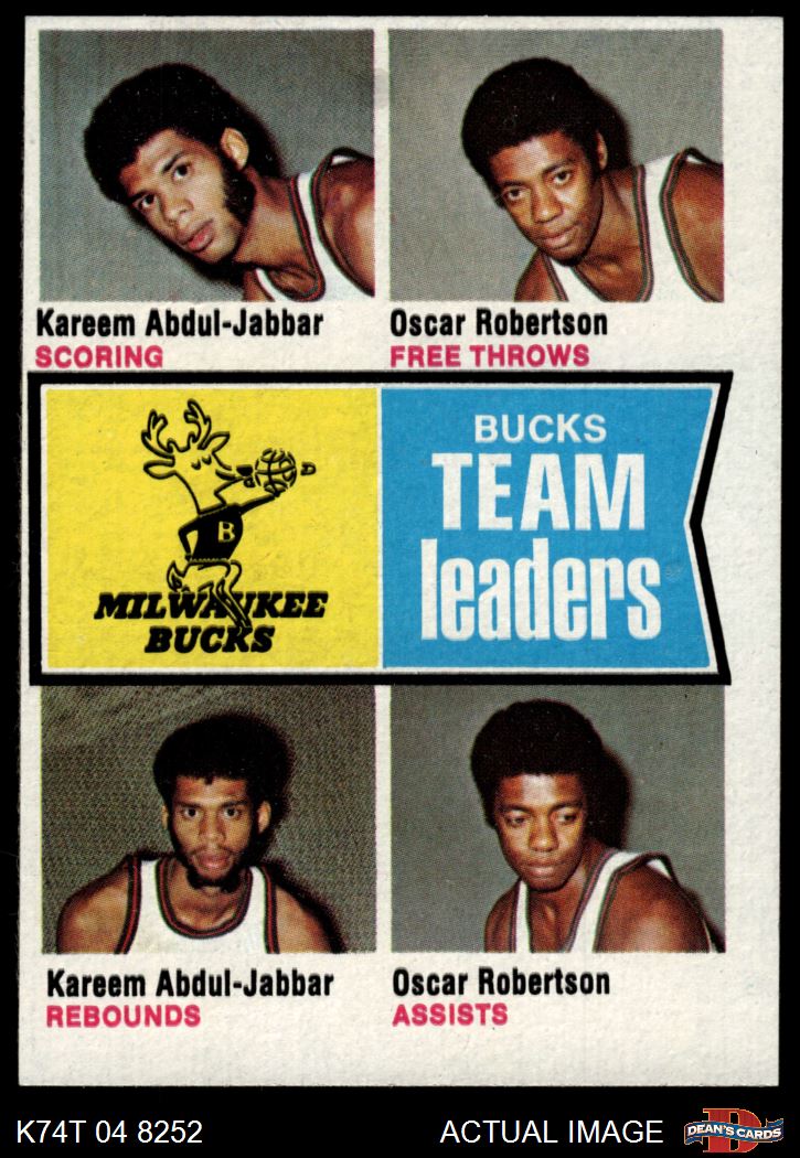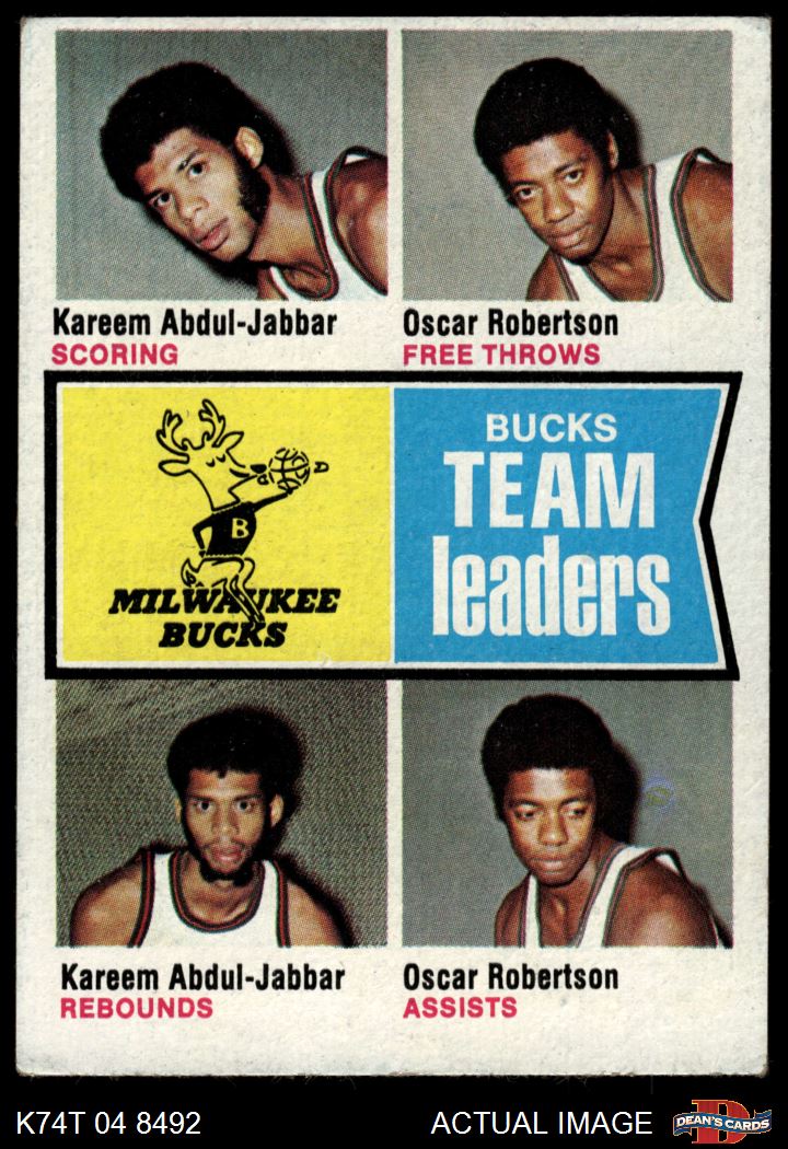 1974 Topps #91 - Oscar Robertson / Kareem Abdul-Jabbar Bucks Leaders 3 - VG