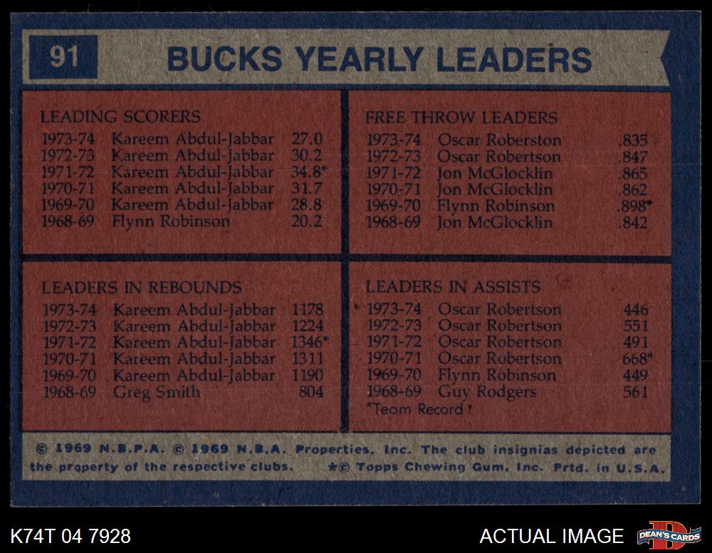 1974 Topps #91 - Oscar Robertson / Kareem Abdul-Jabbar Bucks Leaders 5 - EX