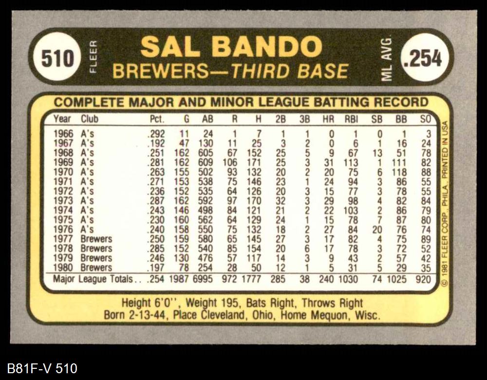 1981 Fleer #510 Sal Bando