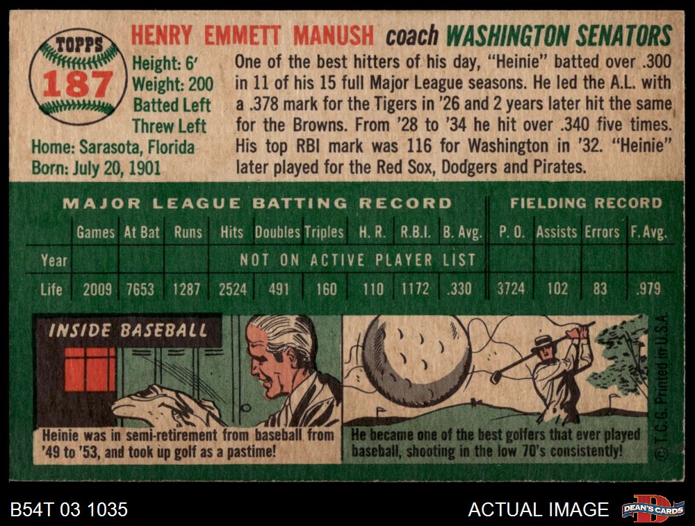 1954 Topps #187 Heinie Manush 6 - EX/MT