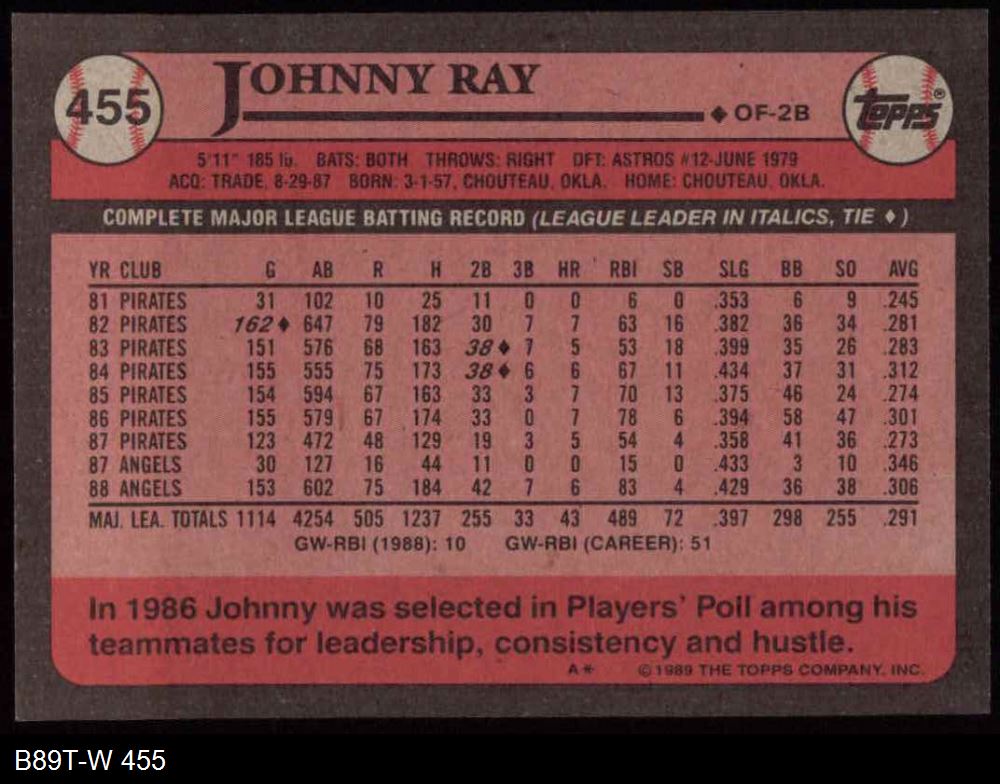 1989 Topps #455 Johnny Ray 8 - NM/MT