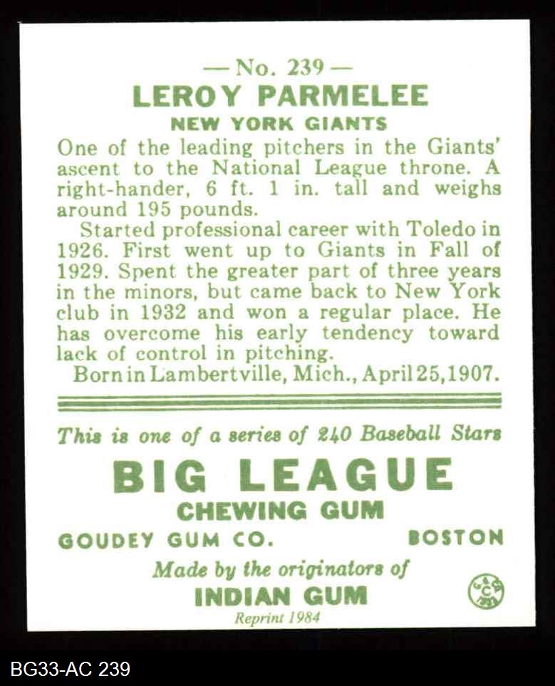 1933 Goudey Reprint #239 Leroy Parmelee 8 - NM/MT