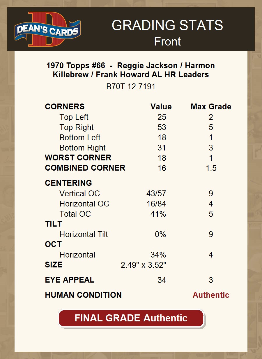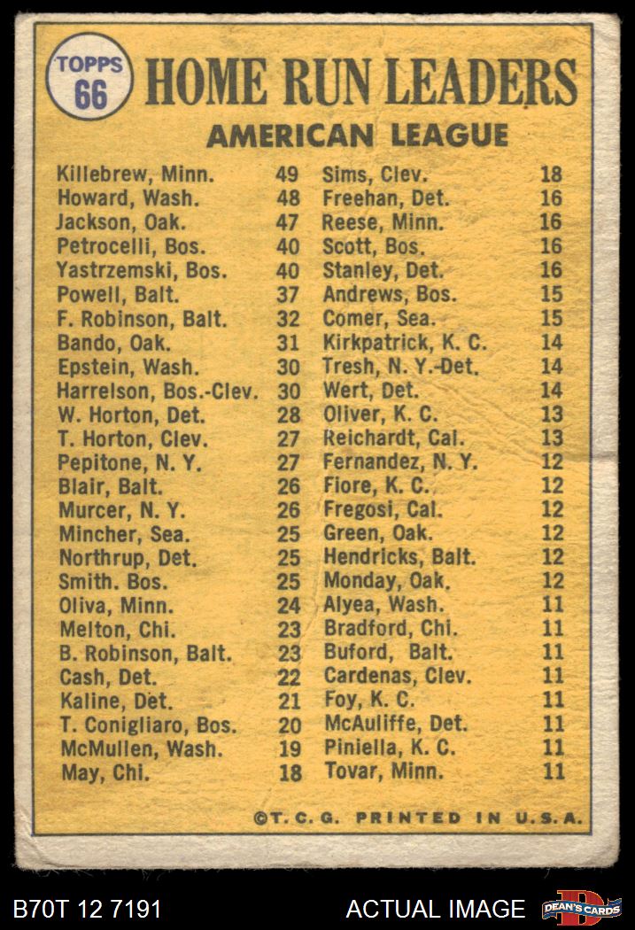 1970 Topps #66 - Reggie Jackson / Harmon Killebrew / Frank Howard AL HR Leaders AUTHENTIC