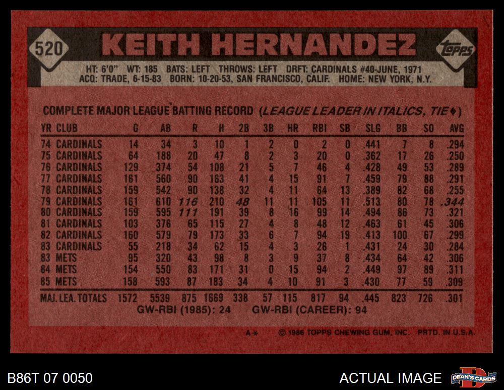 1986 Topps #520 Keith Hernandez