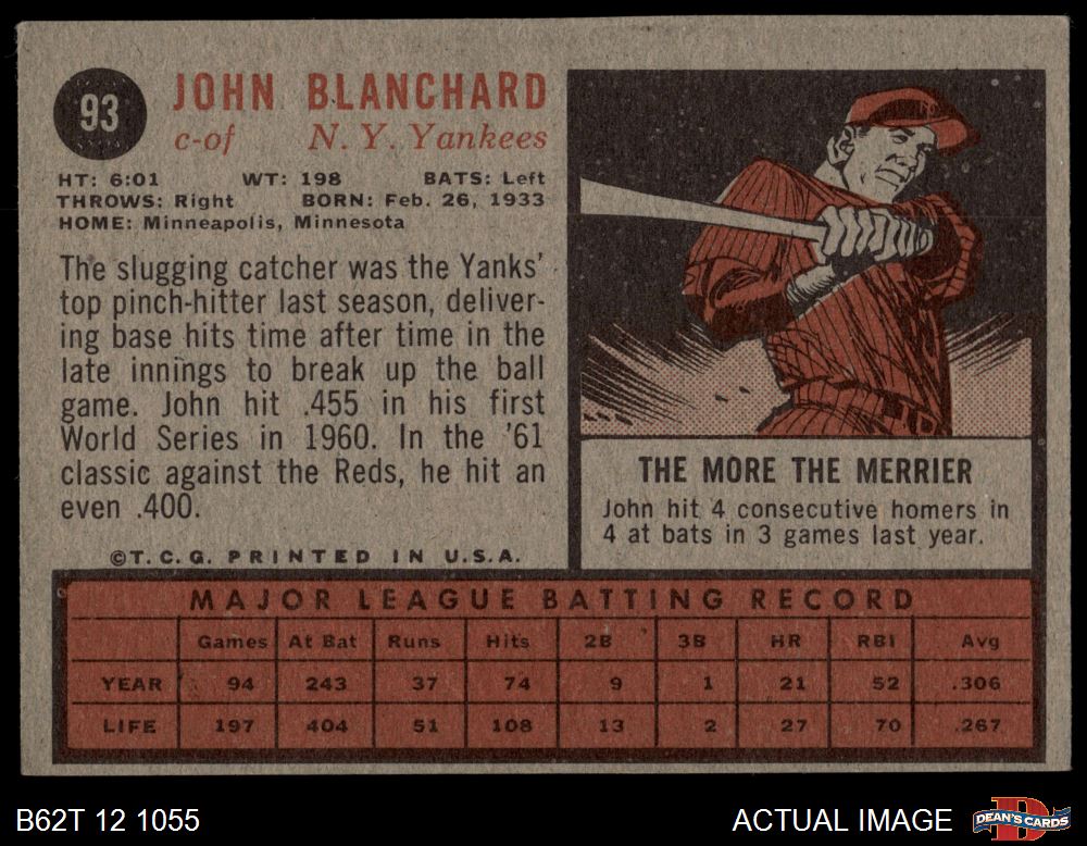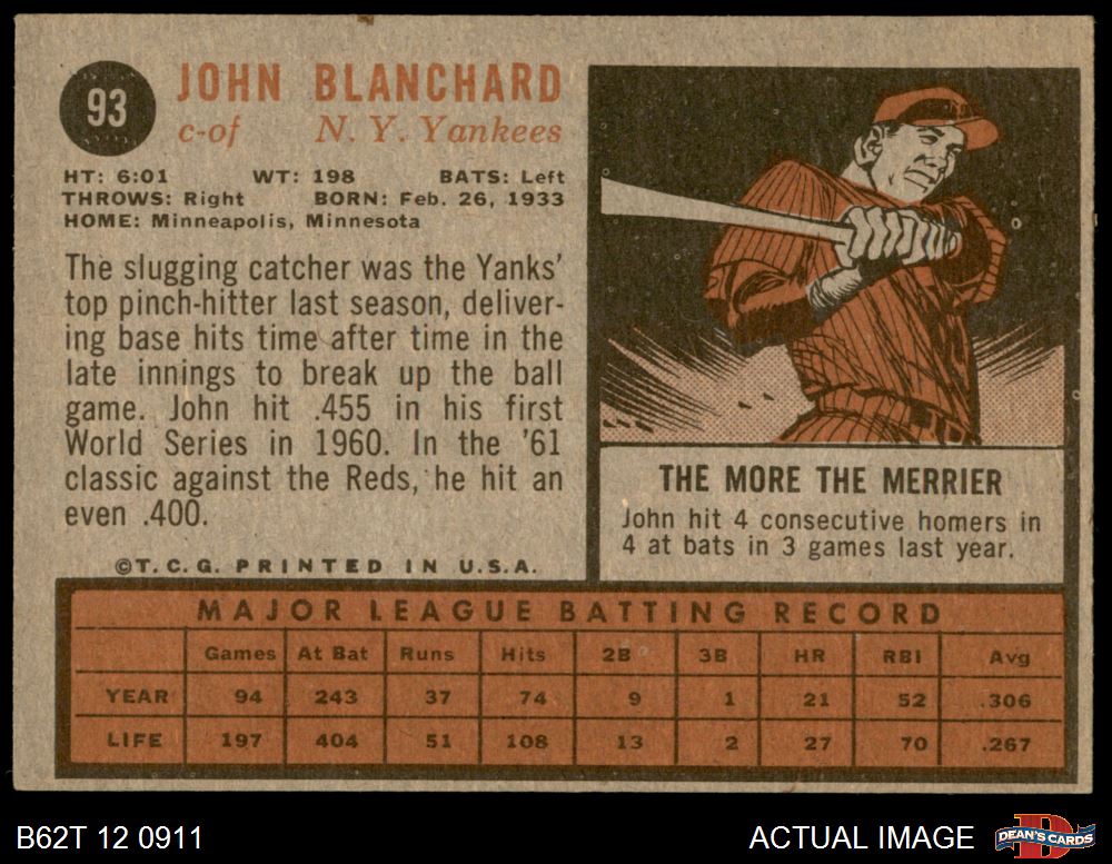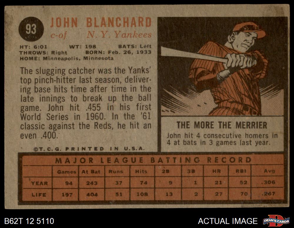 1962 Topps #93 John Blanchard 3 - VG