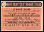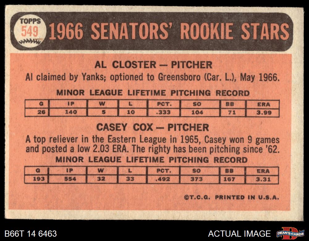 1966 Topps #549 - Casey Cox / Al Closter Senators Rookies 3 - VG