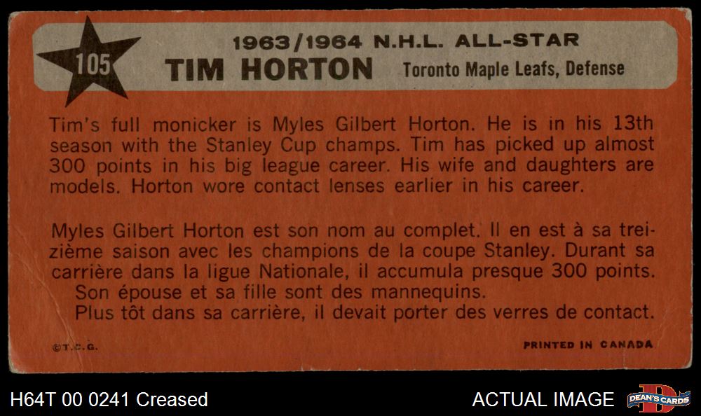 1964 Topps #105 - Tim Horton All-Star 2 - GOOD