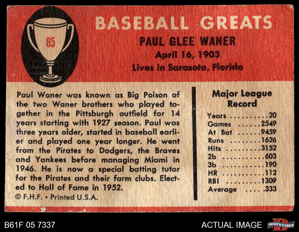 1961 Fleer #85 Paul Waner 3 - VG