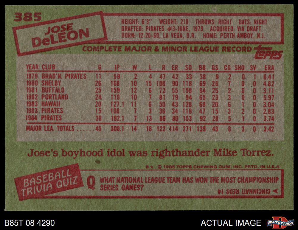 1985 Topps #385 Jose DeLeon 6 - EX/MT